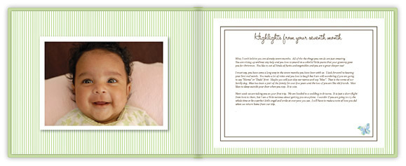 Some important details about our printed baby books.  Finished books are 8 1/2" high x 11" wide.   They are printed on the highest quality HP Indigo printer, the pages are full-bleed (that means every millimeter of space is used to the end of the page), they are professionally bound in a linen embossed hardcover made especially for My Own Little Story. The front cover has a 4¼" x 3¼" window to display an image of your child.