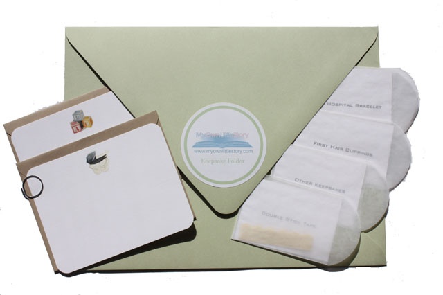 All of our gift vouchers come with a complimentary "Keepsake Folder" (pictured on the left) perfect for storing ultra-sound photos, birth announcements or shower invitations.  In addition, we have included and labeled vellum envelopes for enclosing your child's hospital bracelet and first hair clippings- complete with double stick tape for securing your treasures in a printed book. Finally, we couldn't resist sharing two of our most popular stationery designs- they make a perfect thank-you note or gift enclosure.  Be sure to enter the coupon code: GIFT to receive $6 dollars credit on your shipping!